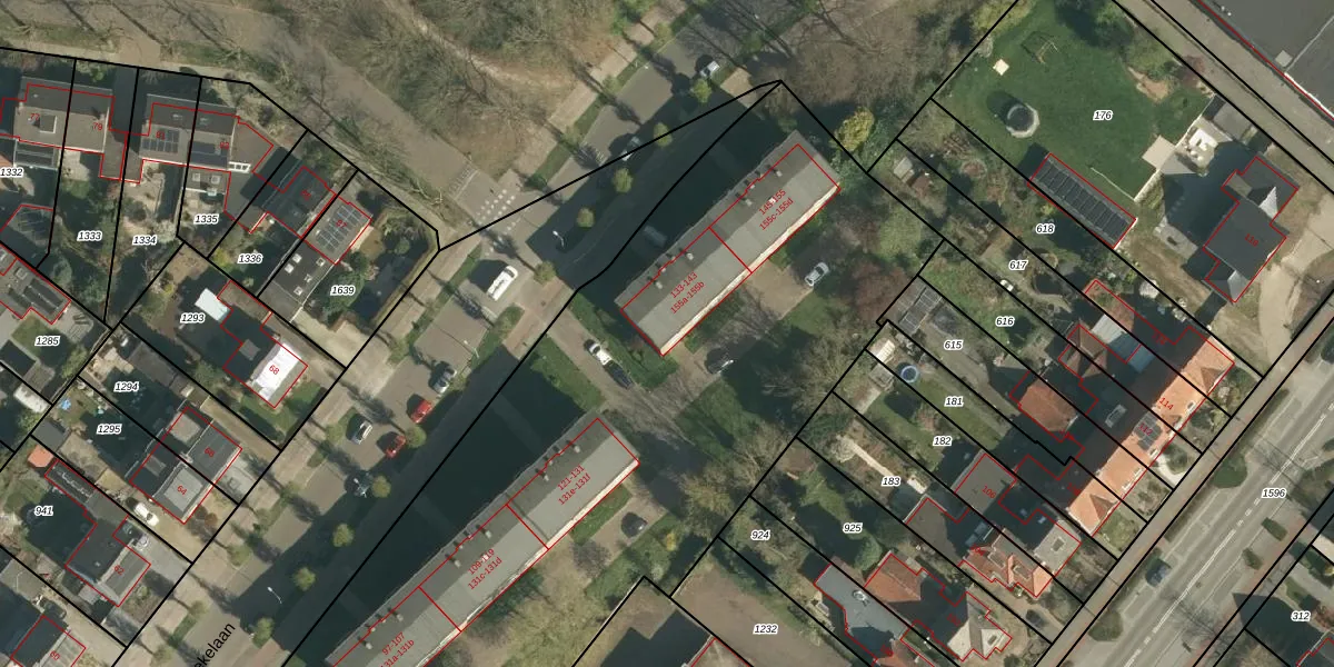 Het perceel waarop Veldekelaan 155-a staat heeft een oppervlakte van 6613 m². Dit is een zeer groot perceel. De perceeloppervlakte wordt geregistreerd door het Kadaster. Gedetailleerde informatie over de maten van dit perceel kunt u vinden in het rapport Kadastrale kaart met maatvoering van Veldekelaan 155-a.