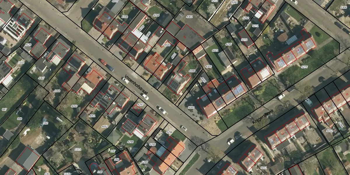 Het perceel waarop Vroenhofstraat 1 staat heeft een oppervlakte van 347 m². Dit is een groot perceel. De perceeloppervlakte wordt geregistreerd door het Kadaster. Gedetailleerde informatie over de maten van dit perceel kunt u vinden in het rapport Kadastrale kaart met maatvoering van Vroenhofstraat 1.