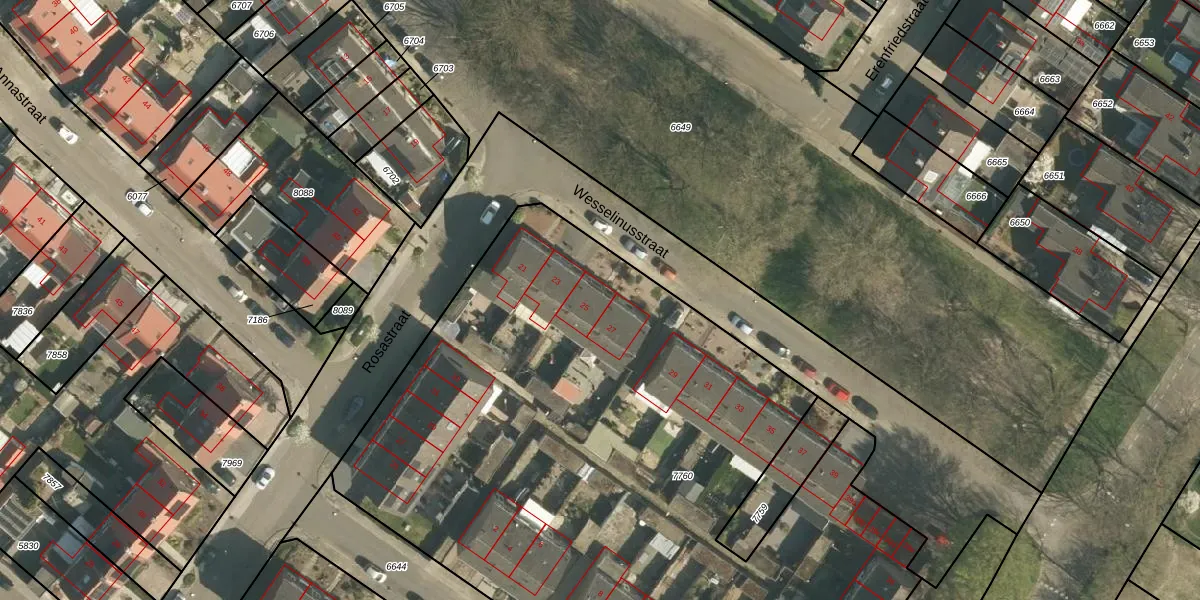 Het perceel waarop Wesselinusstraat 25 staat heeft een oppervlakte van 4963 m². Dit is een zeer groot perceel. De perceeloppervlakte wordt geregistreerd door het Kadaster. Gedetailleerde informatie over de maten van dit perceel kunt u vinden in het rapport Kadastrale kaart met maatvoering van Wesselinusstraat 25.