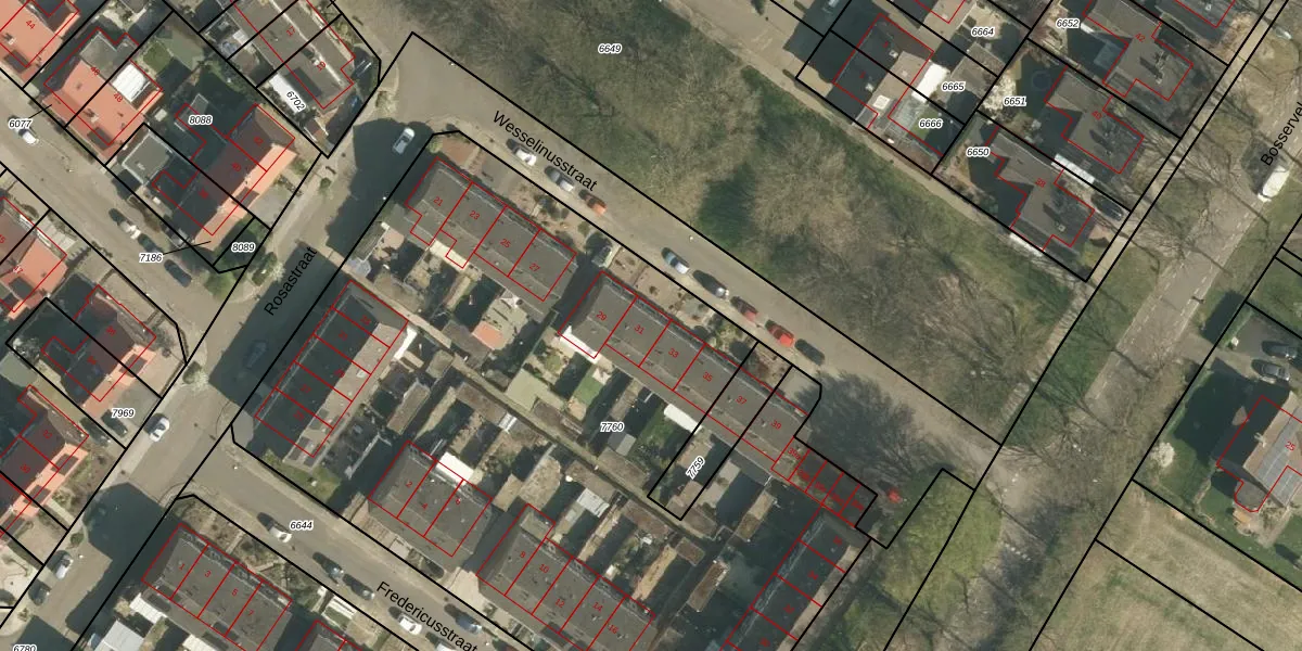 Het perceel waarop Wesselinusstraat 31 staat heeft een oppervlakte van 4963 m². Dit is een zeer groot perceel. De perceeloppervlakte wordt geregistreerd door het Kadaster. Gedetailleerde informatie over de maten van dit perceel kunt u vinden in het rapport Kadastrale kaart met maatvoering van Wesselinusstraat 31.
