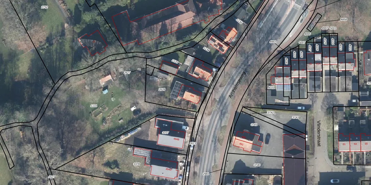 Arnhemseweg 494 is gelegen op kadastraal perceel BBG01M2628. Deze kadastrale aanduiding is uniek en wordt gebruikt door het Kadaster om eigendomsrechten en andere zakelijke rechten vast te leggen. Het perceel maakt onderdeel uit van de kadastrale gemeente Beekbergen.
