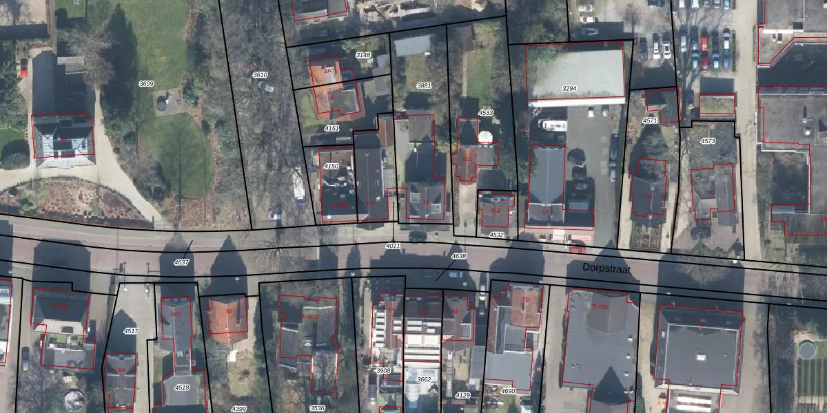 Het perceel waarop Dorpstraat 39-F staat heeft een oppervlakte van 639 m². Dit is een groot perceel. De perceeloppervlakte wordt geregistreerd door het Kadaster. Gedetailleerde informatie over de maten van dit perceel kunt u vinden in het rapport Kadastrale kaart met maatvoering van Dorpstraat 39-F.