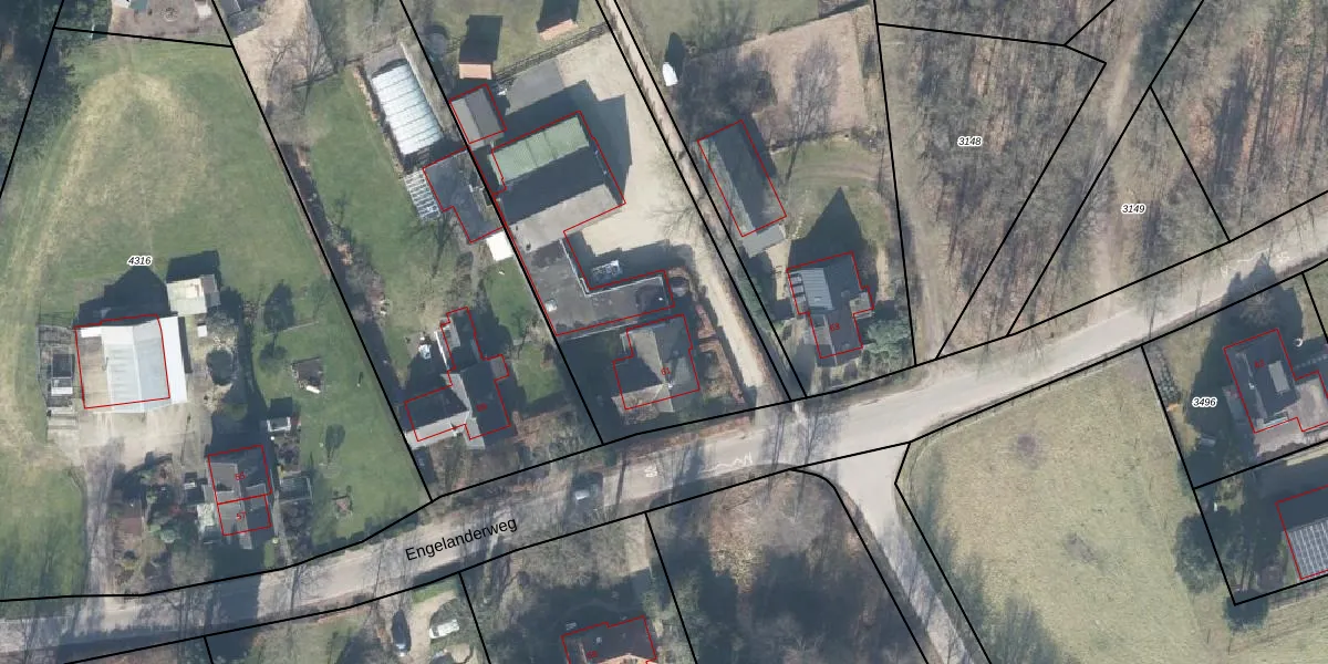Het perceel waarop Engelanderweg 61 staat heeft een oppervlakte van 3870 m². Dit is een zeer groot perceel. De perceeloppervlakte wordt geregistreerd door het Kadaster. Gedetailleerde informatie over de maten van dit perceel kunt u vinden in het rapport Kadastrale kaart met maatvoering van Engelanderweg 61.