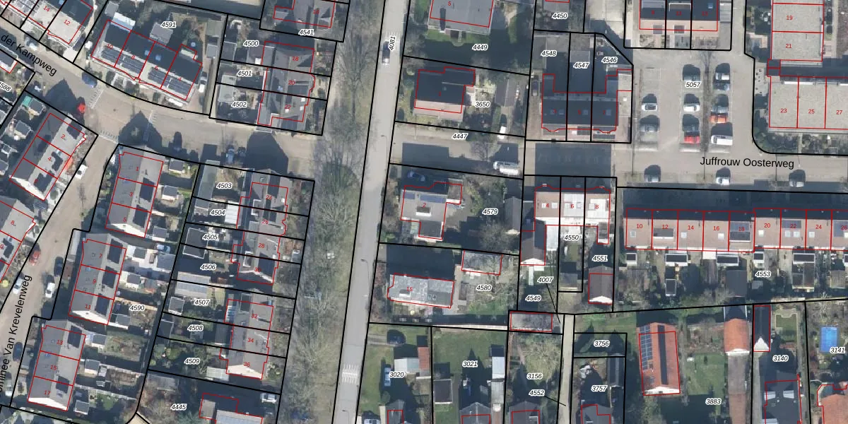Het perceel waarop Juffrouw Oosterweg 2 staat heeft een oppervlakte van 600 m². Dit is een groot perceel. De perceeloppervlakte wordt geregistreerd door het Kadaster. Gedetailleerde informatie over de maten van dit perceel kunt u vinden in het rapport Kadastrale kaart met maatvoering van Juffrouw Oosterweg 2.