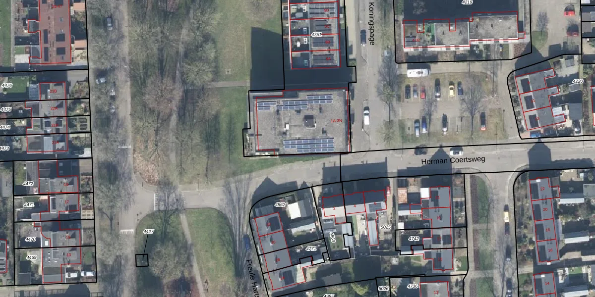 Het perceel waarop Koningspage 3-A staat heeft een oppervlakte van 2000 m². Dit is een zeer groot perceel. De perceeloppervlakte wordt geregistreerd door het Kadaster. Gedetailleerde informatie over de maten van dit perceel kunt u vinden in het rapport Kadastrale kaart met maatvoering van Koningspage 3-A.