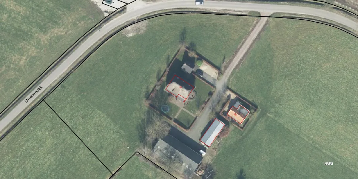 Het perceel waarop Drostendijk 58 staat heeft een oppervlakte van 2,5 ha. Dit is een zeer groot perceel. De perceeloppervlakte wordt geregistreerd door het Kadaster. Gedetailleerde informatie over de maten van dit perceel kunt u vinden in het rapport Kadastrale kaart met maatvoering van Drostendijk 58.
