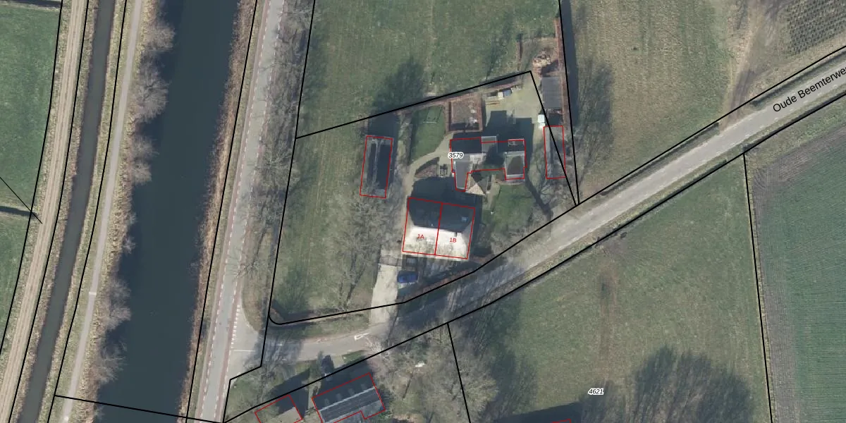 Het perceel waarop Oude Beemterweg 1-A staat heeft een oppervlakte van 2772 m². Dit is een zeer groot perceel. De perceeloppervlakte wordt geregistreerd door het Kadaster. Gedetailleerde informatie over de maten van dit perceel kunt u vinden in het rapport Kadastrale kaart met maatvoering van Oude Beemterweg 1-A.