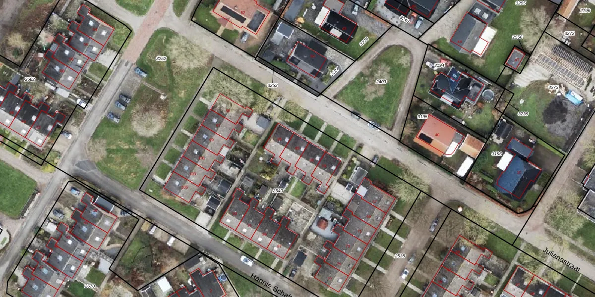Het perceel waarop Julianastraat 83 staat heeft een oppervlakte van 3957 m². Dit is een zeer groot perceel. De perceeloppervlakte wordt geregistreerd door het Kadaster. Gedetailleerde informatie over de maten van dit perceel kunt u vinden in het rapport Kadastrale kaart met maatvoering van Julianastraat 83.