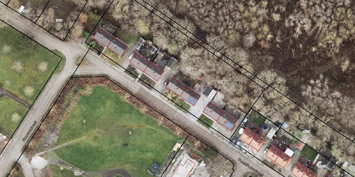 Het perceel waarop Raadhuisstraat 64 staat heeft een oppervlakte van 3480 m². Dit is een zeer groot perceel. De perceeloppervlakte wordt geregistreerd door het Kadaster. Gedetailleerde informatie over de maten van dit perceel kunt u vinden in het rapport Kadastrale kaart met maatvoering van Raadhuisstraat 64.