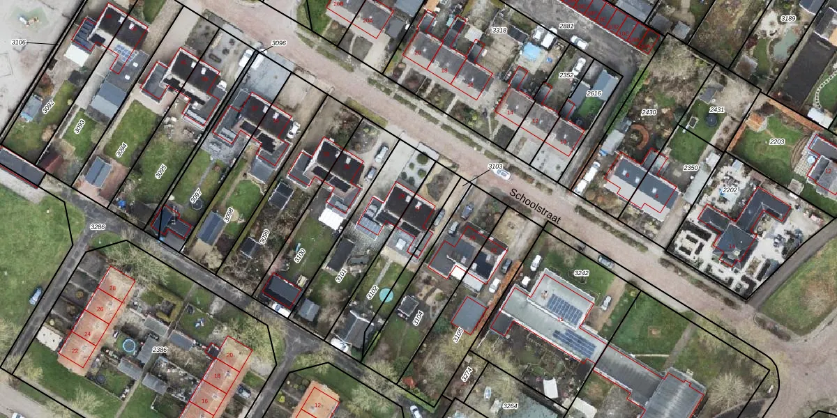 Het perceel waarop Schoolstraat 27 staat heeft een oppervlakte van 379 m². Dit is een groot perceel. De perceeloppervlakte wordt geregistreerd door het Kadaster. Gedetailleerde informatie over de maten van dit perceel kunt u vinden in het rapport Kadastrale kaart met maatvoering van Schoolstraat 27.