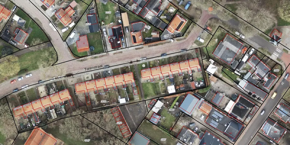 Het perceel waarop Torenstraat 11 staat heeft een oppervlakte van 3820 m². Dit is een zeer groot perceel. De perceeloppervlakte wordt geregistreerd door het Kadaster. Gedetailleerde informatie over de maten van dit perceel kunt u vinden in het rapport Kadastrale kaart met maatvoering van Torenstraat 11.