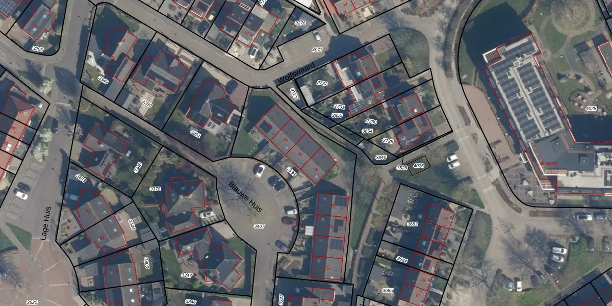 Het perceel waarop Blauwe Huis 35 staat heeft een oppervlakte van 1372 m². Dit is een zeer groot perceel. De perceeloppervlakte wordt geregistreerd door het Kadaster. Gedetailleerde informatie over de maten van dit perceel kunt u vinden in het rapport Kadastrale kaart met maatvoering van Blauwe Huis 35.
