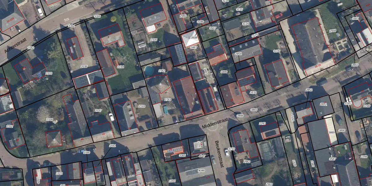 Het perceel waarop Middenstraat 36 staat heeft een oppervlakte van 905 m². Dit is een groot perceel. De perceeloppervlakte wordt geregistreerd door het Kadaster. Gedetailleerde informatie over de maten van dit perceel kunt u vinden in het rapport Kadastrale kaart met maatvoering van Middenstraat 36.