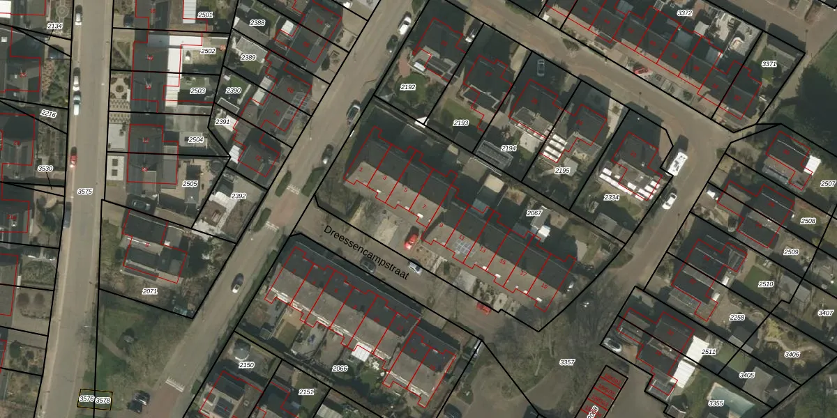 Het perceel waarop Dreessencampstraat 7 staat heeft een oppervlakte van 1955 m². Dit is een zeer groot perceel. De perceeloppervlakte wordt geregistreerd door het Kadaster. Gedetailleerde informatie over de maten van dit perceel kunt u vinden in het rapport Kadastrale kaart met maatvoering van Dreessencampstraat 7.