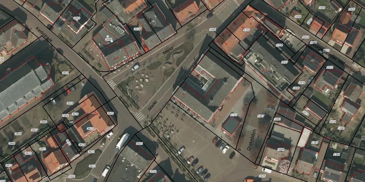 Het perceel waarop Markt 13 staat heeft een oppervlakte van 1350 m². Dit is een zeer groot perceel. De perceeloppervlakte wordt geregistreerd door het Kadaster. Gedetailleerde informatie over de maten van dit perceel kunt u vinden in het rapport Kadastrale kaart met maatvoering van Markt 13.