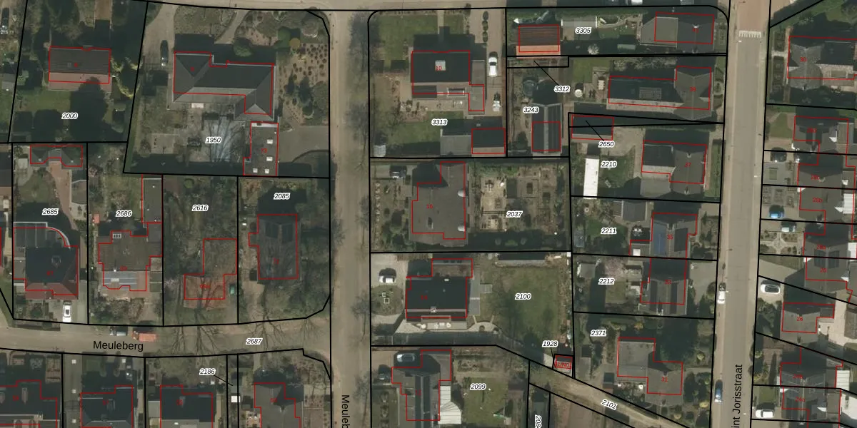 Het perceel waarop Meuleberg 16 staat heeft een oppervlakte van 1035 m². Dit is een zeer groot perceel. De perceeloppervlakte wordt geregistreerd door het Kadaster. Gedetailleerde informatie over de maten van dit perceel kunt u vinden in het rapport Kadastrale kaart met maatvoering van Meuleberg 16.