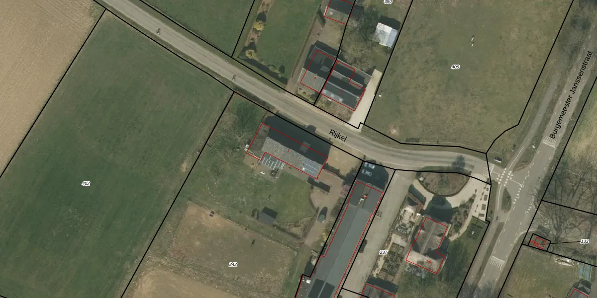 Het perceel waarop Rijkel 1 staat heeft een oppervlakte van 4590 m². Dit is een zeer groot perceel. De perceeloppervlakte wordt geregistreerd door het Kadaster. Gedetailleerde informatie over de maten van dit perceel kunt u vinden in het rapport Kadastrale kaart met maatvoering van Rijkel 1.