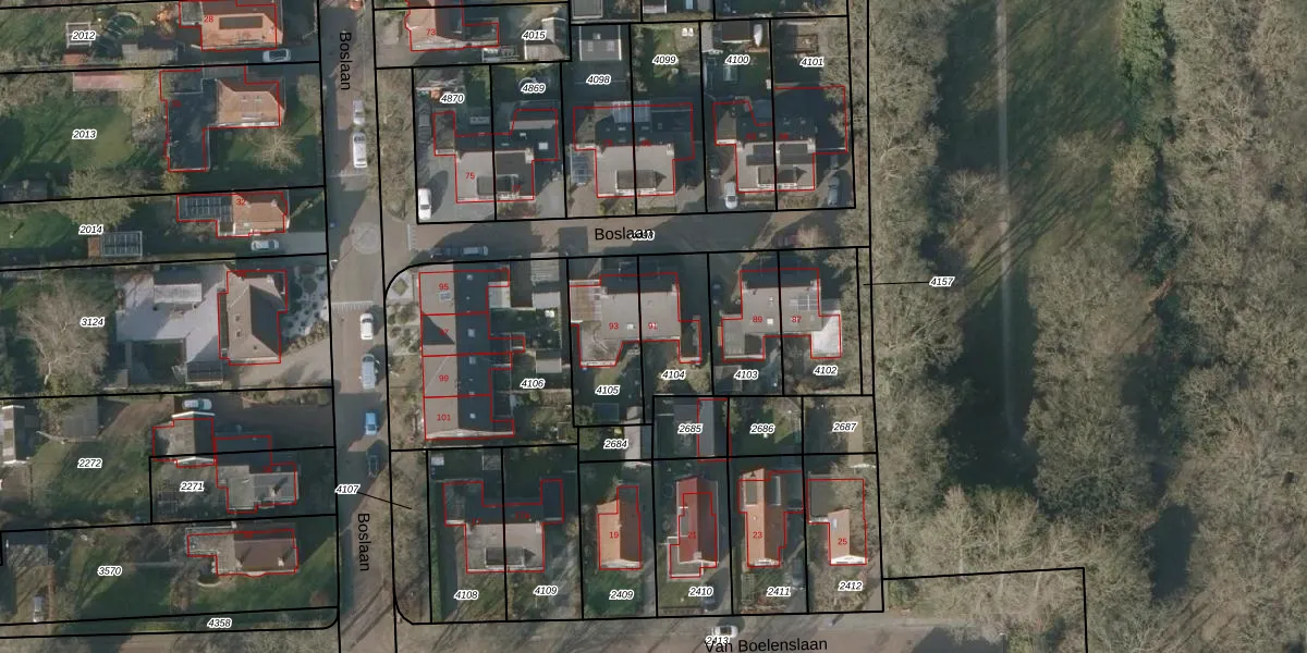 Het perceel waarop Boslaan 91 staat heeft een oppervlakte van 241 m². Dit is een middelgroot perceel. De perceeloppervlakte wordt geregistreerd door het Kadaster. Gedetailleerde informatie over de maten van dit perceel kunt u vinden in het rapport Kadastrale kaart met maatvoering van Boslaan 91.