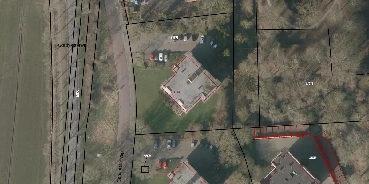 Het perceel waarop Commissieweg 43 staat heeft een oppervlakte van 3335 m². Dit is een zeer groot perceel. De perceeloppervlakte wordt geregistreerd door het Kadaster. Gedetailleerde informatie over de maten van dit perceel kunt u vinden in het rapport Kadastrale kaart met maatvoering van Commissieweg 43.