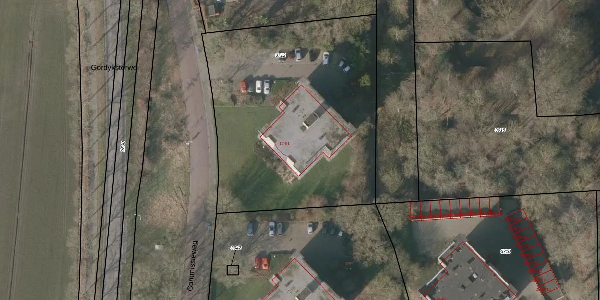 Het perceel waarop Commissieweg 45 staat heeft een oppervlakte van 3335 m². Dit is een zeer groot perceel. De perceeloppervlakte wordt geregistreerd door het Kadaster. Gedetailleerde informatie over de maten van dit perceel kunt u vinden in het rapport Kadastrale kaart met maatvoering van Commissieweg 45.