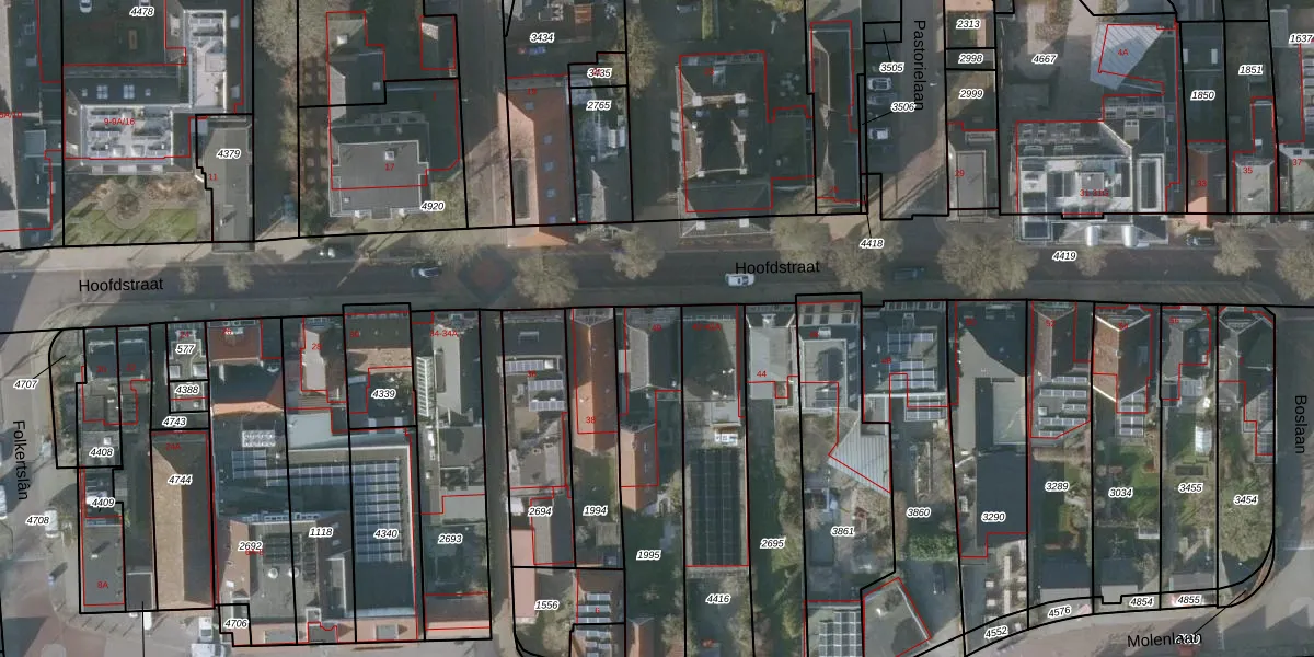 Het perceel waarop Hoofdstraat 40 staat heeft een oppervlakte van 550 m². Dit is een groot perceel. De perceeloppervlakte wordt geregistreerd door het Kadaster. Gedetailleerde informatie over de maten van dit perceel kunt u vinden in het rapport Kadastrale kaart met maatvoering van Hoofdstraat 40.