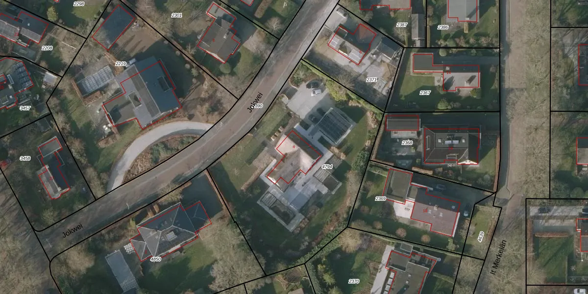 Het perceel waarop Jokwei 4 staat heeft een oppervlakte van 2509 m². Dit is een zeer groot perceel. De perceeloppervlakte wordt geregistreerd door het Kadaster. Gedetailleerde informatie over de maten van dit perceel kunt u vinden in het rapport Kadastrale kaart met maatvoering van Jokwei 4.