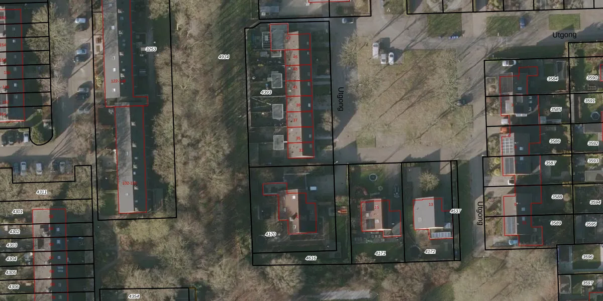 Het perceel waarop Utgong 33 staat heeft een oppervlakte van 1332 m². Dit is een zeer groot perceel. De perceeloppervlakte wordt geregistreerd door het Kadaster. Gedetailleerde informatie over de maten van dit perceel kunt u vinden in het rapport Kadastrale kaart met maatvoering van Utgong 33.