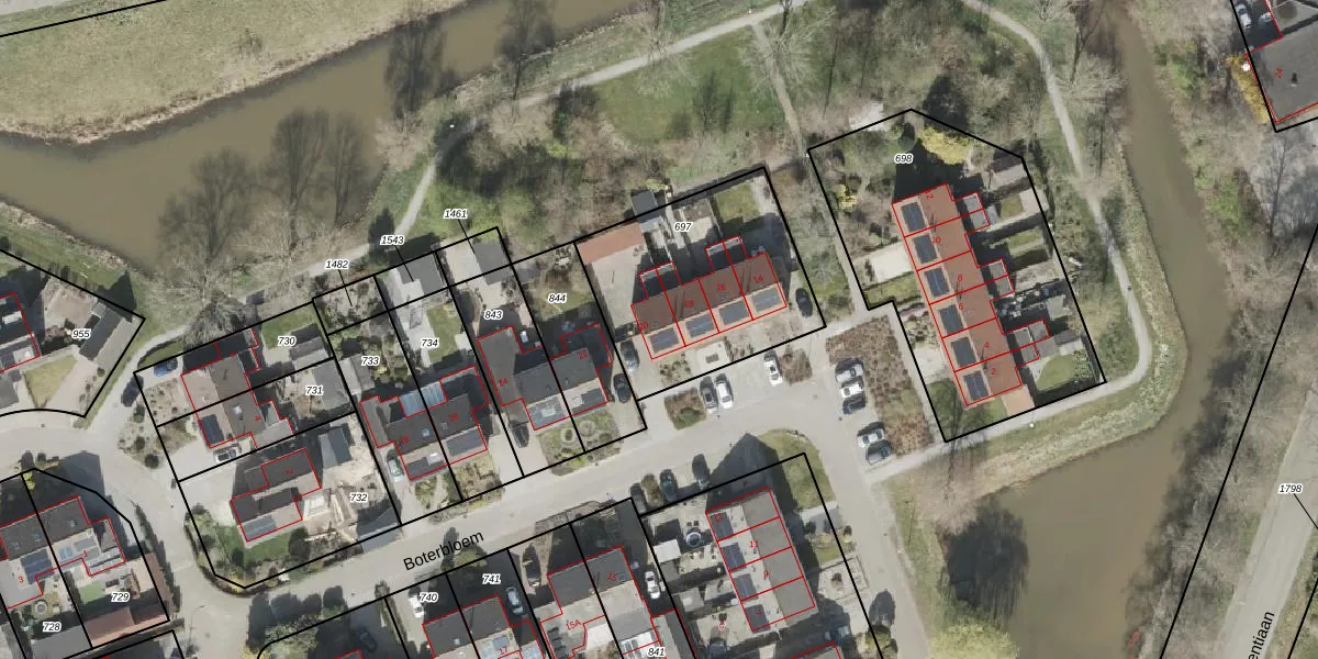 Het perceel waarop Boterbloem 20 staat heeft een oppervlakte van 805 m². Dit is een groot perceel. De perceeloppervlakte wordt geregistreerd door het Kadaster. Gedetailleerde informatie over de maten van dit perceel kunt u vinden in het rapport Kadastrale kaart met maatvoering van Boterbloem 20.