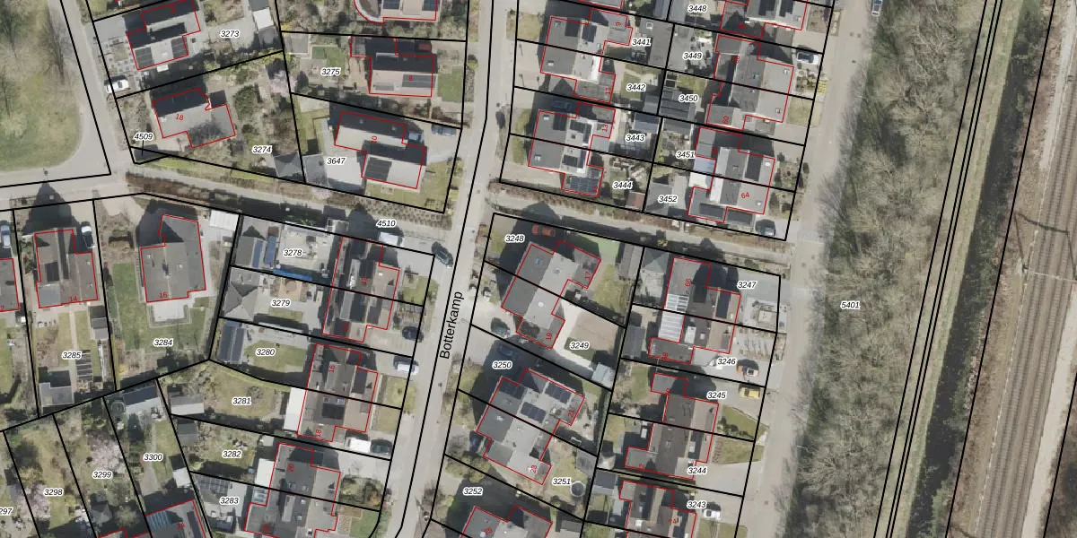 Het perceel waarop Botterkamp 17 staat heeft een oppervlakte van 352 m². Dit is een groot perceel. De perceeloppervlakte wordt geregistreerd door het Kadaster. Gedetailleerde informatie over de maten van dit perceel kunt u vinden in het rapport Kadastrale kaart met maatvoering van Botterkamp 17.