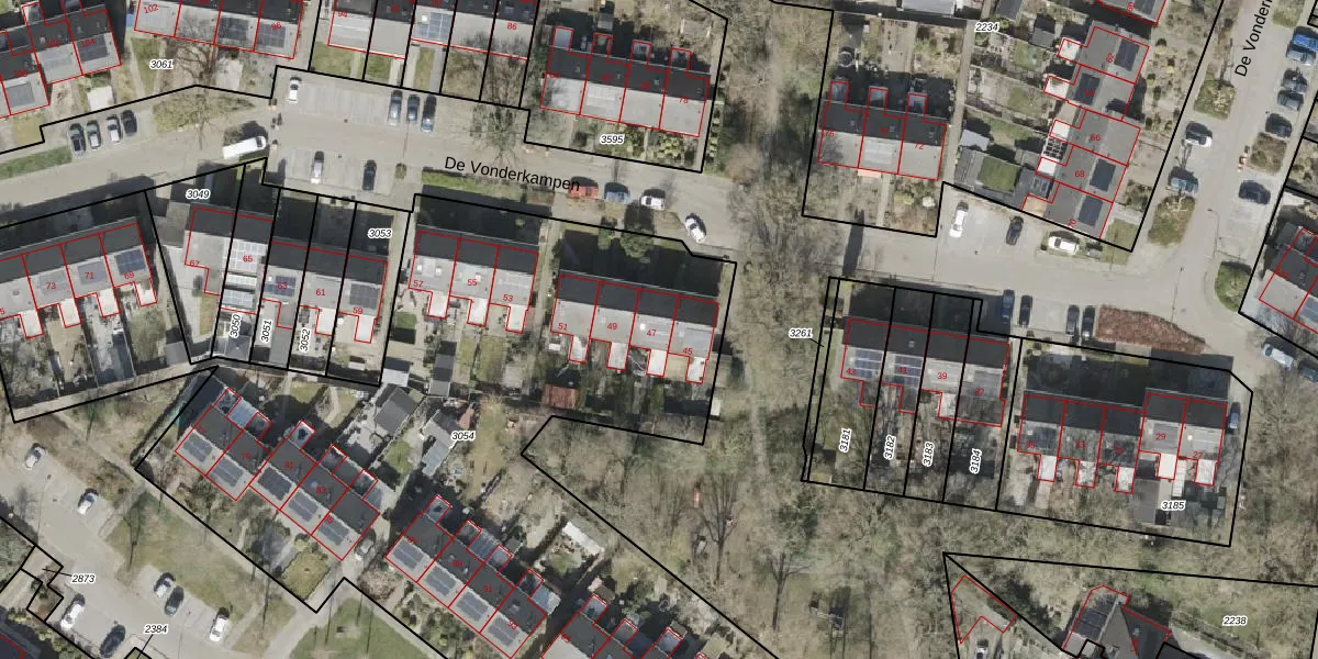 Het perceel waarop De Vonderkampen 47 staat heeft een oppervlakte van 6149 m². Dit is een zeer groot perceel. De perceeloppervlakte wordt geregistreerd door het Kadaster. Gedetailleerde informatie over de maten van dit perceel kunt u vinden in het rapport Kadastrale kaart met maatvoering van De Vonderkampen 47.