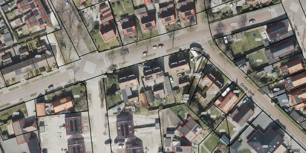 Het perceel waarop Grote Drift 21 staat heeft een oppervlakte van 4576 m². Dit is een zeer groot perceel. De perceeloppervlakte wordt geregistreerd door het Kadaster. Gedetailleerde informatie over de maten van dit perceel kunt u vinden in het rapport Kadastrale kaart met maatvoering van Grote Drift 21.