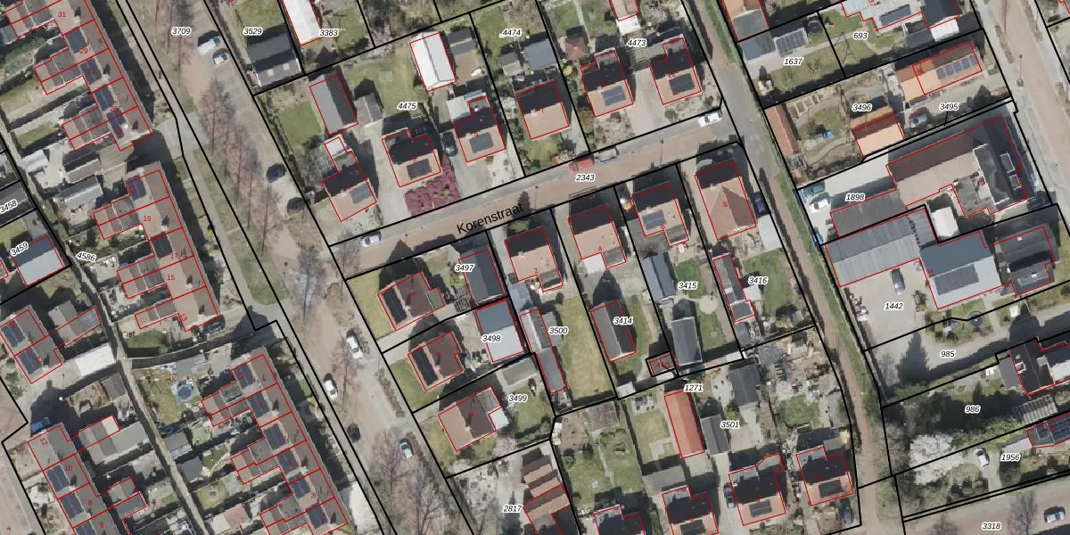 Het perceel waarop Korenstraat 2 staat heeft een oppervlakte van 465 m². Dit is een groot perceel. De perceeloppervlakte wordt geregistreerd door het Kadaster. Gedetailleerde informatie over de maten van dit perceel kunt u vinden in het rapport Kadastrale kaart met maatvoering van Korenstraat 2.