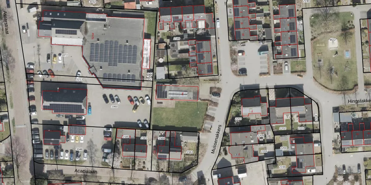 Het perceel waarop Mussenakkers 1-A staat heeft een oppervlakte van 3,1 ha. Dit is een zeer groot perceel. De perceeloppervlakte wordt geregistreerd door het Kadaster. Gedetailleerde informatie over de maten van dit perceel kunt u vinden in het rapport Kadastrale kaart met maatvoering van Mussenakkers 1-A.