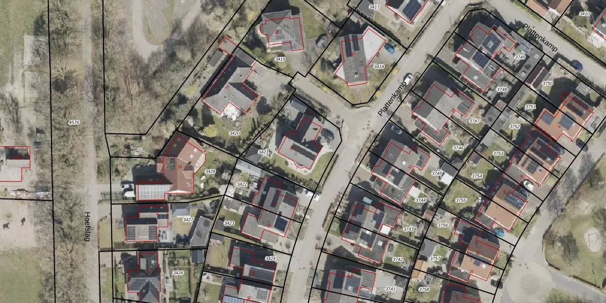 Het perceel waarop Plattenkamp 72 staat heeft een oppervlakte van 585 m². Dit is een groot perceel. De perceeloppervlakte wordt geregistreerd door het Kadaster. Gedetailleerde informatie over de maten van dit perceel kunt u vinden in het rapport Kadastrale kaart met maatvoering van Plattenkamp 72.