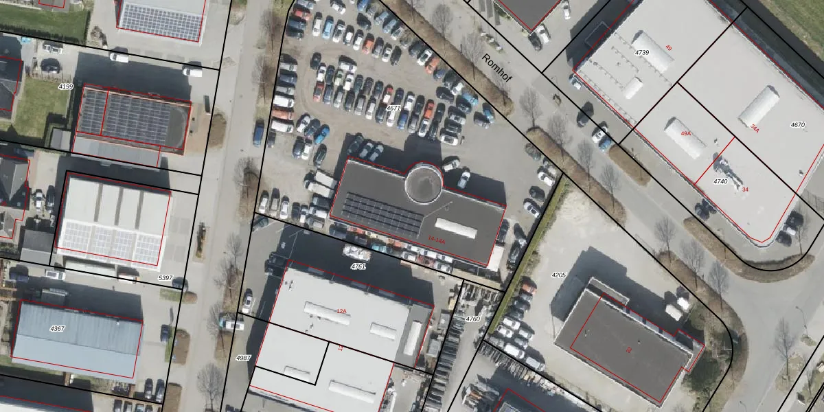 Het perceel waarop Romhof 14 staat heeft een oppervlakte van 3473 m². Dit is een zeer groot perceel. De perceeloppervlakte wordt geregistreerd door het Kadaster. Gedetailleerde informatie over de maten van dit perceel kunt u vinden in het rapport Kadastrale kaart met maatvoering van Romhof 14.