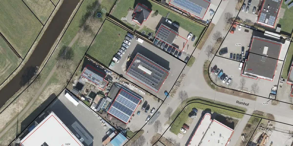 Het perceel waarop Romhof 23 staat heeft een oppervlakte van 1847 m². Dit is een zeer groot perceel. De perceeloppervlakte wordt geregistreerd door het Kadaster. Gedetailleerde informatie over de maten van dit perceel kunt u vinden in het rapport Kadastrale kaart met maatvoering van Romhof 23.