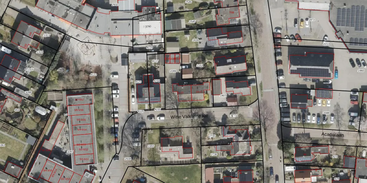 Het perceel waarop Witte Valkenstraat 13 staat heeft een oppervlakte van 555 m². Dit is een groot perceel. De perceeloppervlakte wordt geregistreerd door het Kadaster. Gedetailleerde informatie over de maten van dit perceel kunt u vinden in het rapport Kadastrale kaart met maatvoering van Witte Valkenstraat 13.