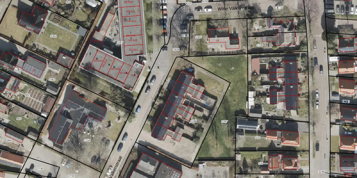Het perceel waarop Witte Valkenstraat 14 staat heeft een oppervlakte van 1815 m². Dit is een zeer groot perceel. De perceeloppervlakte wordt geregistreerd door het Kadaster. Gedetailleerde informatie over de maten van dit perceel kunt u vinden in het rapport Kadastrale kaart met maatvoering van Witte Valkenstraat 14.