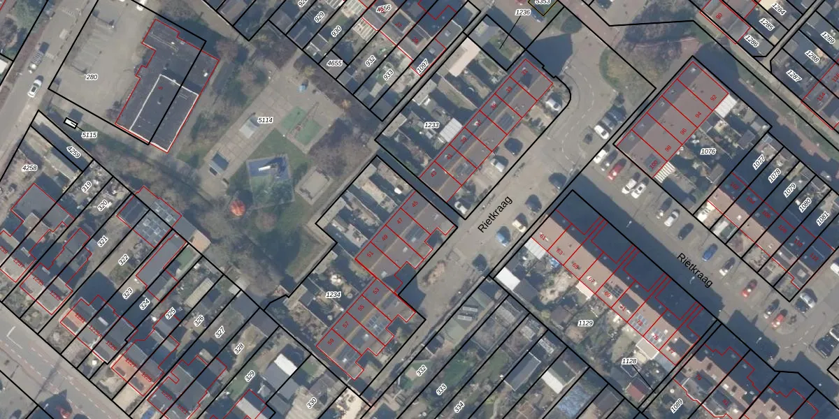 Het perceel waarop Rietkraag 45 staat heeft een oppervlakte van 1224 m². Dit is een zeer groot perceel. De perceeloppervlakte wordt geregistreerd door het Kadaster. Gedetailleerde informatie over de maten van dit perceel kunt u vinden in het rapport Kadastrale kaart met maatvoering van Rietkraag 45.
