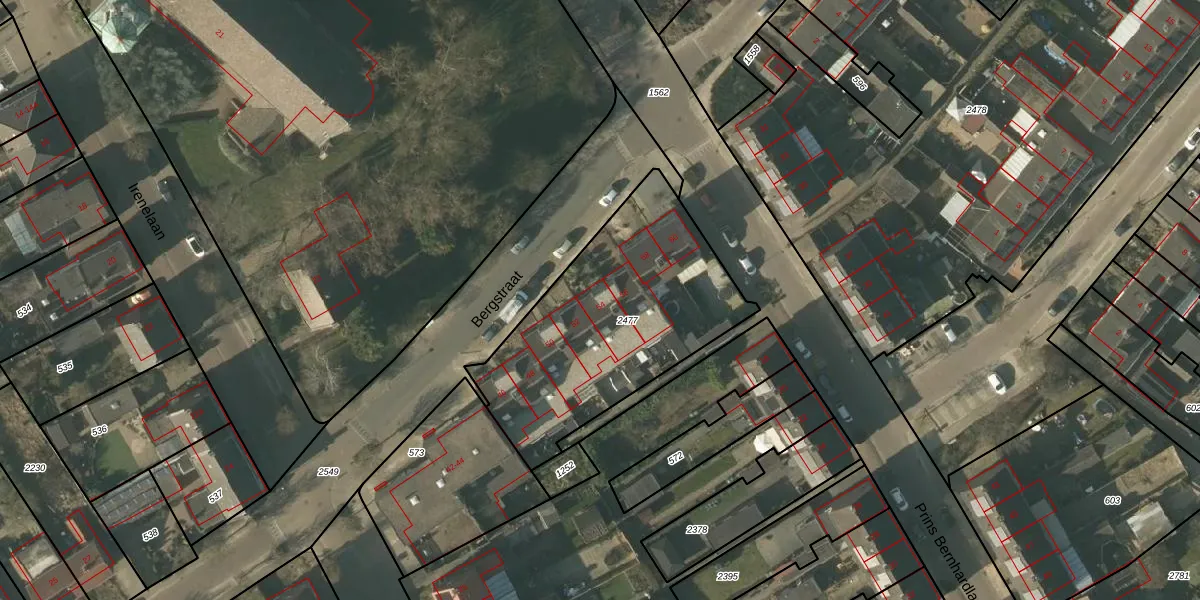 Het perceel waarop Bergstraat 54 staat heeft een oppervlakte van 1070 m². Dit is een zeer groot perceel. De perceeloppervlakte wordt geregistreerd door het Kadaster. Gedetailleerde informatie over de maten van dit perceel kunt u vinden in het rapport Kadastrale kaart met maatvoering van Bergstraat 54.