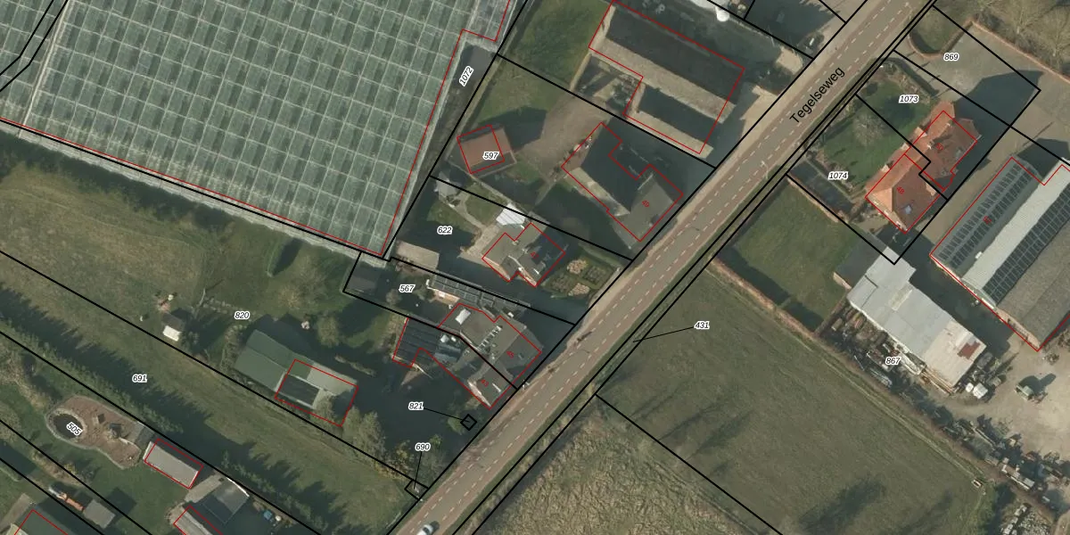 Het perceel waarop Tegelseweg 47 staat heeft een oppervlakte van 635 m². Dit is een groot perceel. De perceeloppervlakte wordt geregistreerd door het Kadaster. Gedetailleerde informatie over de maten van dit perceel kunt u vinden in het rapport Kadastrale kaart met maatvoering van Tegelseweg 47.