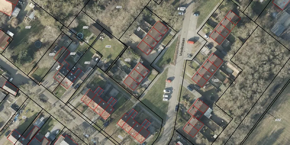 Het perceel waarop Vredeslaan 21 staat heeft een oppervlakte van 1484 m². Dit is een zeer groot perceel. De perceeloppervlakte wordt geregistreerd door het Kadaster. Gedetailleerde informatie over de maten van dit perceel kunt u vinden in het rapport Kadastrale kaart met maatvoering van Vredeslaan 21.