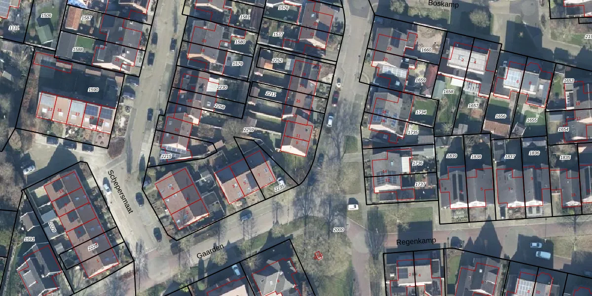 Het perceel waarop Gaarden 9 staat heeft een oppervlakte van 1789 m². Dit is een zeer groot perceel. De perceeloppervlakte wordt geregistreerd door het Kadaster. Gedetailleerde informatie over de maten van dit perceel kunt u vinden in het rapport Kadastrale kaart met maatvoering van Gaarden 9.