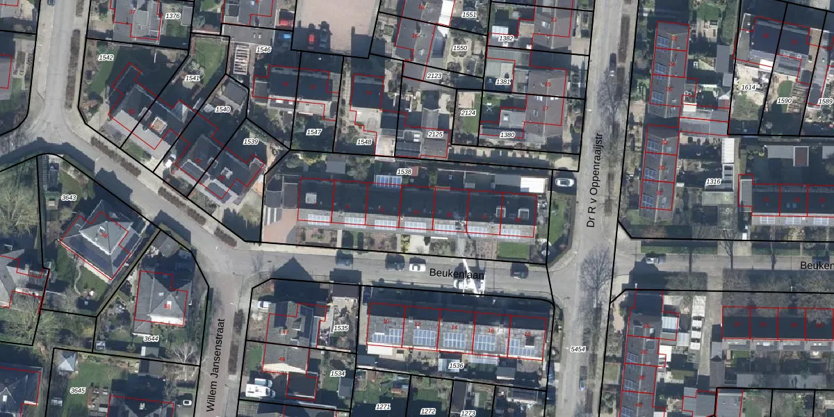 Het perceel waarop Beukenlaan 13 staat heeft een oppervlakte van 1549 m². Dit is een zeer groot perceel. De perceeloppervlakte wordt geregistreerd door het Kadaster. Gedetailleerde informatie over de maten van dit perceel kunt u vinden in het rapport Kadastrale kaart met maatvoering van Beukenlaan 13.