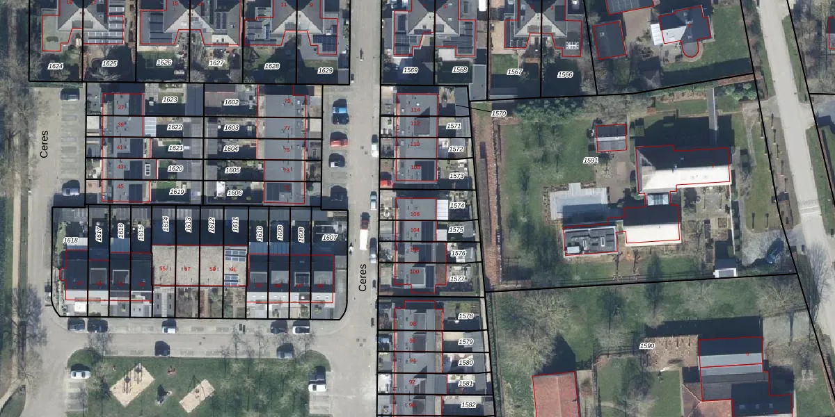 Het perceel waarop Ceres 106 staat heeft een oppervlakte van 174 m². Dit is een middelgroot perceel. De perceeloppervlakte wordt geregistreerd door het Kadaster. Gedetailleerde informatie over de maten van dit perceel kunt u vinden in het rapport Kadastrale kaart met maatvoering van Ceres 106.
