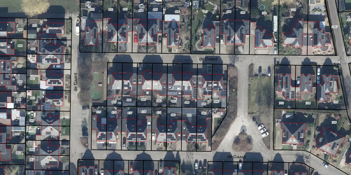 Het perceel waarop de Gaard 50 staat heeft een oppervlakte van 213 m². Dit is een middelgroot perceel. De perceeloppervlakte wordt geregistreerd door het Kadaster. Gedetailleerde informatie over de maten van dit perceel kunt u vinden in het rapport Kadastrale kaart met maatvoering van de Gaard 50.