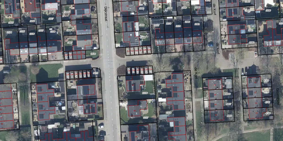Het perceel waarop de Korf 13-c staat heeft een oppervlakte van 19 m². Dit is een klein perceel. De perceeloppervlakte wordt geregistreerd door het Kadaster. Gedetailleerde informatie over de maten van dit perceel kunt u vinden in het rapport Kadastrale kaart met maatvoering van de Korf 13-c.