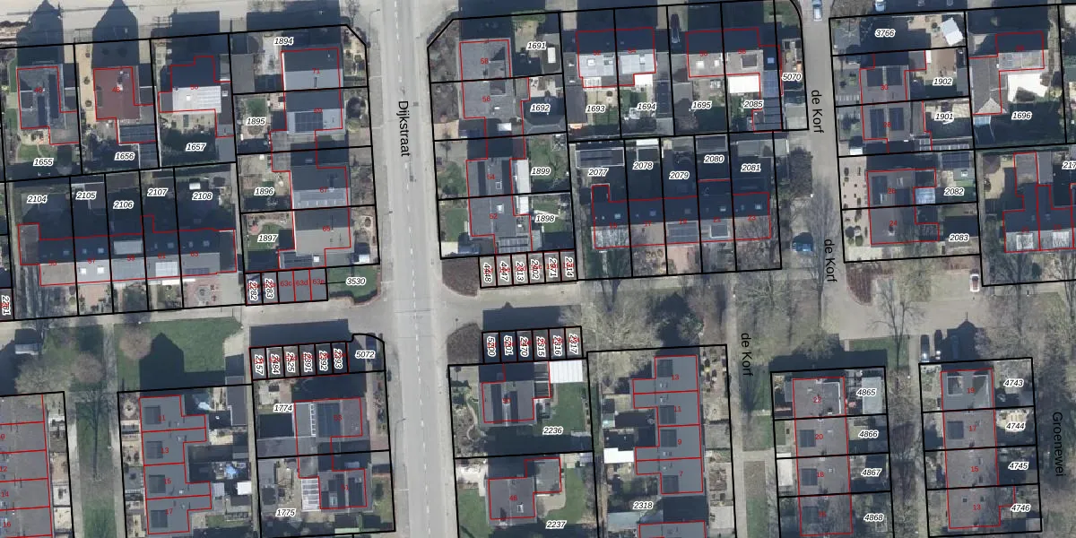 Het perceel waarop de Korf 15-c staat heeft een oppervlakte van 18 m². Dit is een klein perceel. De perceeloppervlakte wordt geregistreerd door het Kadaster. Gedetailleerde informatie over de maten van dit perceel kunt u vinden in het rapport Kadastrale kaart met maatvoering van de Korf 15-c.