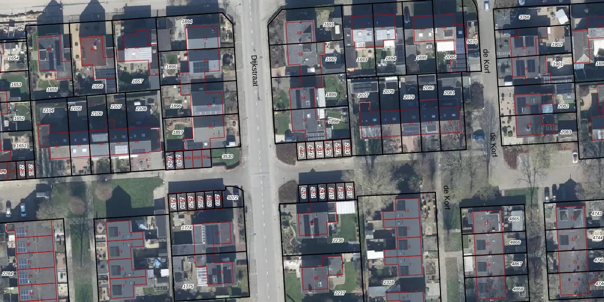Het perceel waarop de Korf 15-f staat heeft een oppervlakte van 18 m². Dit is een klein perceel. De perceeloppervlakte wordt geregistreerd door het Kadaster. Gedetailleerde informatie over de maten van dit perceel kunt u vinden in het rapport Kadastrale kaart met maatvoering van de Korf 15-f.