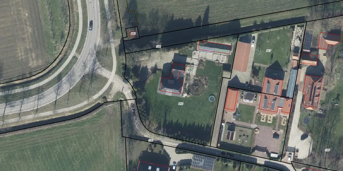 de Pas 1 is gelegen op kadastraal perceel BML02L955. Deze kadastrale aanduiding is uniek en wordt gebruikt door het Kadaster om eigendomsrechten en andere zakelijke rechten vast te leggen. Het perceel maakt onderdeel uit van de kadastrale gemeente Bemmel.
